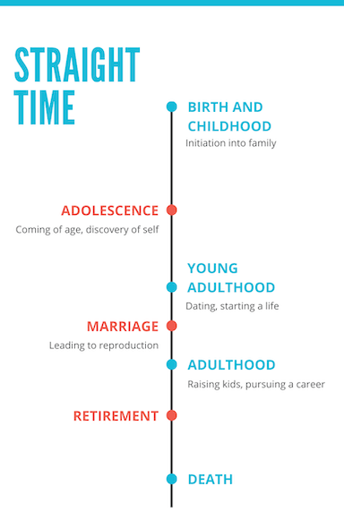 “Straight time” is usually perceived as linear. The various events of a person’s life are more or less pre-assumed, and build on previous experiences. A child is born, comes of age and discovers themself in adolescence, dates other people, gets married, raises kids and pursues a career, and finally retires to relax in the abundance that they have produced.